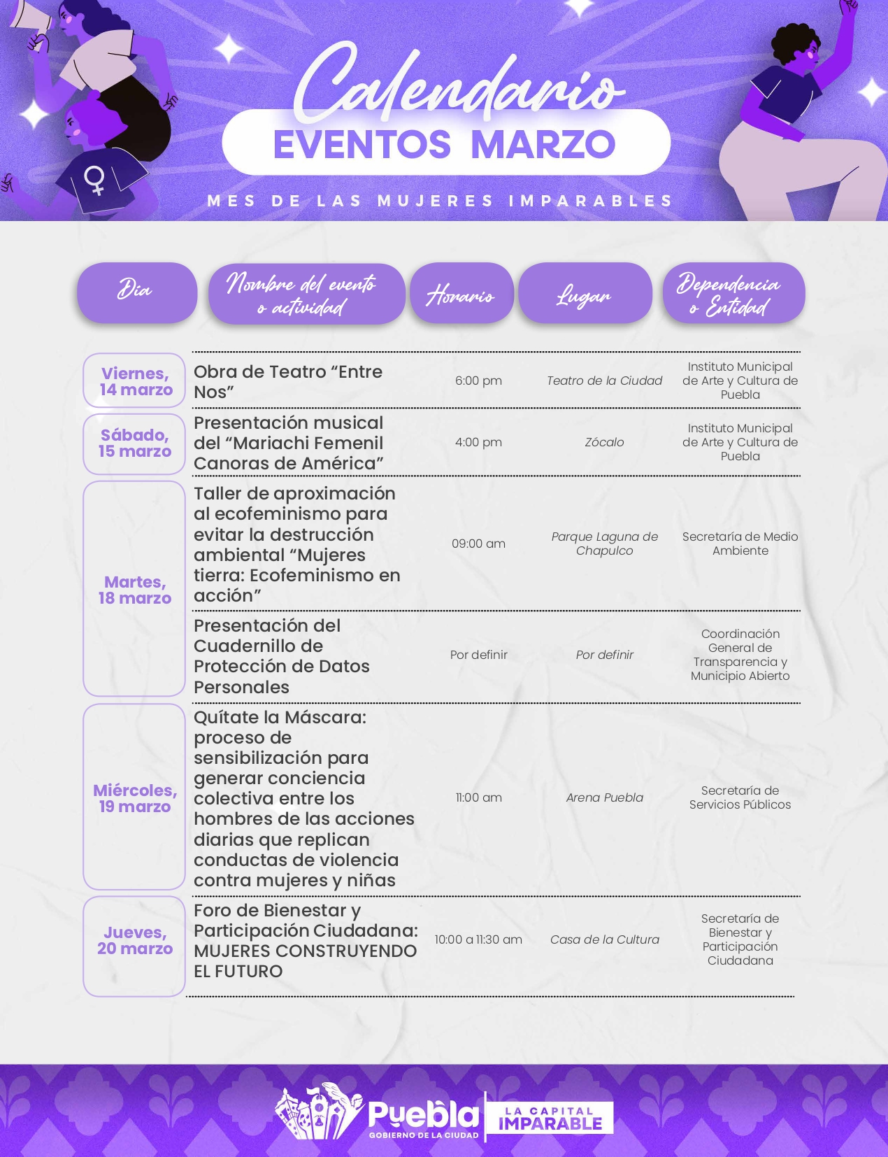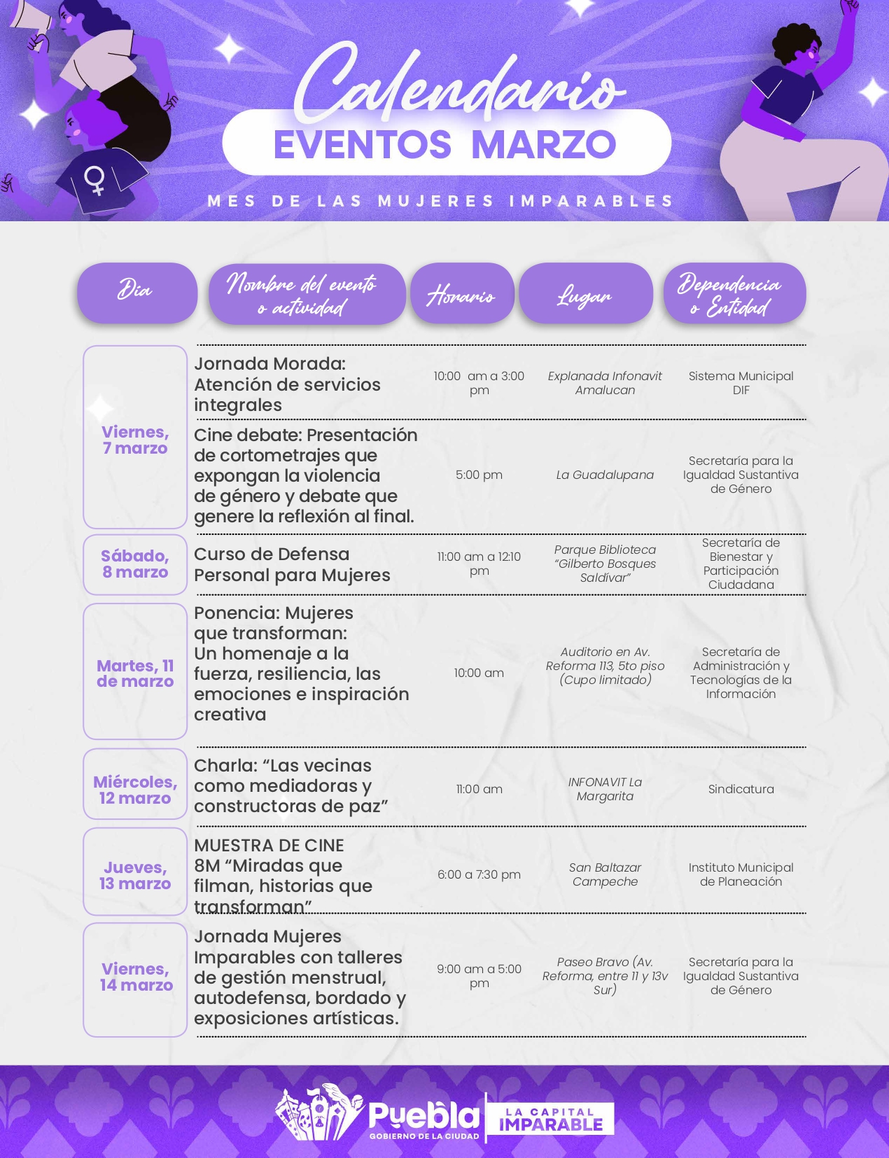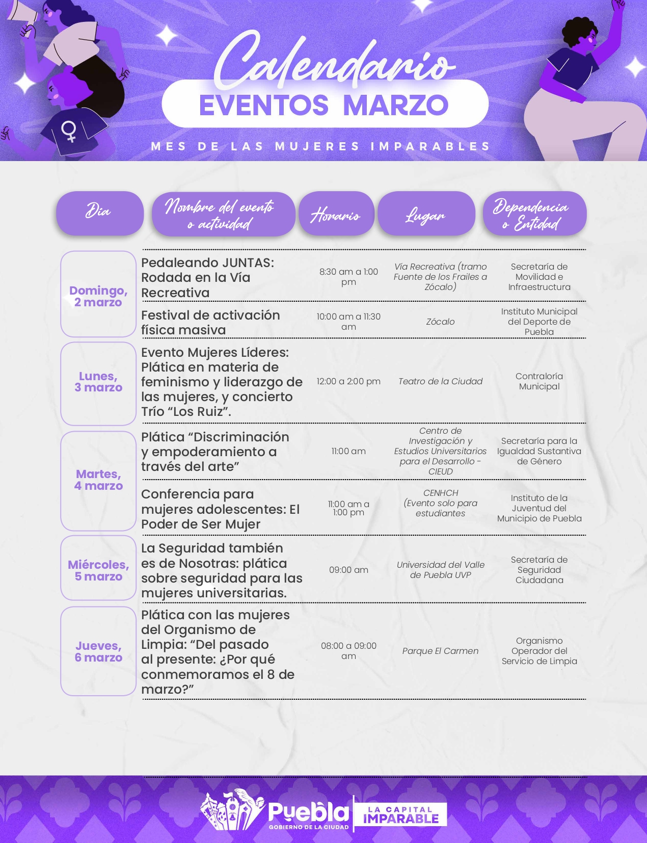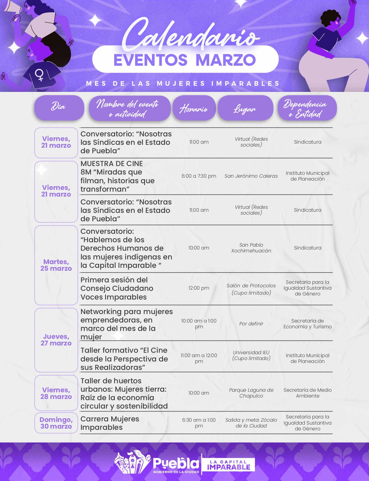 El Ayuntamiento de Puebla lanza el programa “Mes de las Mujeres Imparables”, una iniciativa diseñada para promover la igualdad de género y empoderar a las mujeres con actividades diversas durante todo marzo.