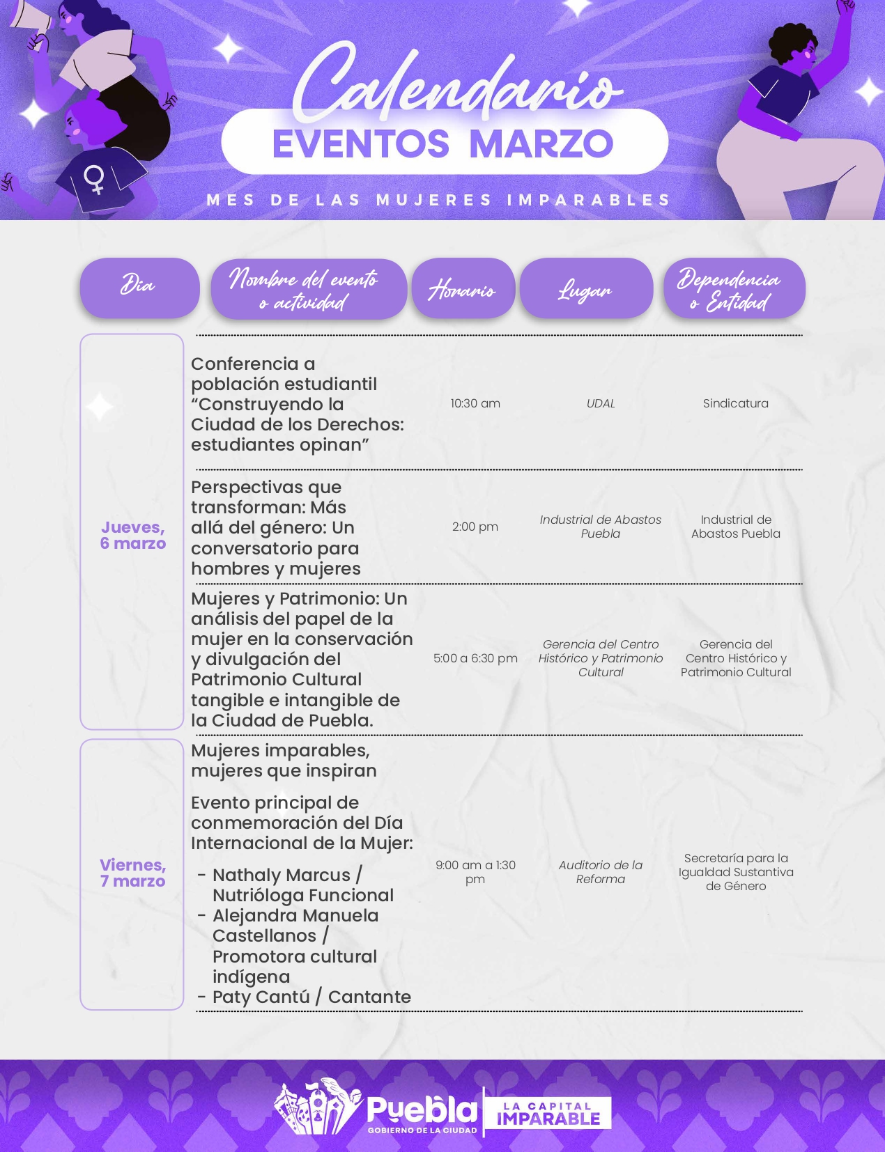 Destacando en laagenda, el miércoles 5 de marzo se abordará la seguridad de las mujeres universitarias con la charla “La Seguridad también es de Nosotras” en la Universidad del Valle de Puebla.